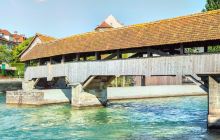 斯普洛耶桥是琉森最著名的两座廊桥之一,建于1408年,其檐下有67幅木板彩画ldquo;死亡之舞rdquo;,由Kaspar Meglinger于1626年绘制。这些画描述了当年欧洲的黑死病流行景象,画中人物无论男女老幼、贵贱贫富,终将难逃死神的召唤,十分震撼。ldquo;Spreuerrdquo;一词在德语中有ldquo;谷壳rdquo;的意思,当时这座桥是唯一能将麦壳倾倒入河的地方,因此也叫谷糠桥。过桥走向北岸,左前方就是去往穆塞格城墙的路。